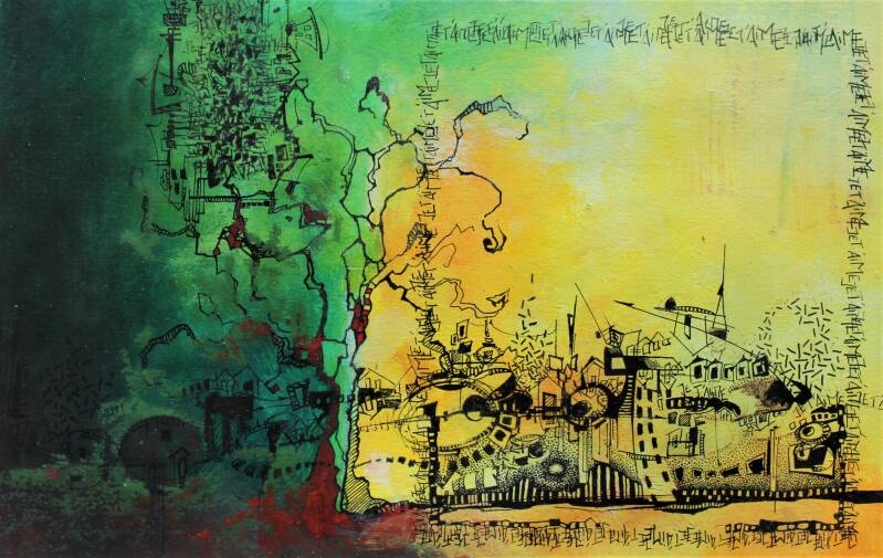 Acrylic, oil pastel and China ink on paper. 14,5 x 23 cm